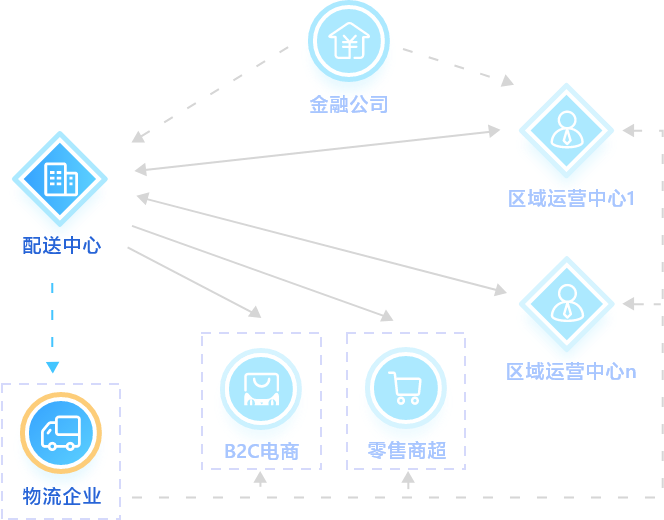 配送中心(Hub)通过上平台协同业务,实现业务订单全生命周期管理和数据可视化。同时可以根据上游加工企业(spoke)和下游经销商(spoke)信息化协同意愿进行场景配置